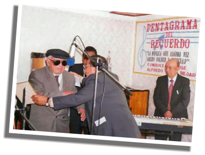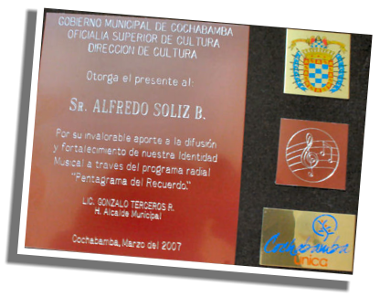 Acompañando A Sus Oyentes en varias ciudades de Bolivia''Pentagrama del Recuerdo: la música que alguna vez quiso volver a escuchar..." dice la característica que se convirtió en la tarjeta de presentación de uno de los programas radiales de mayor sintonía en Cochabamba y varias ciudades de Bolivia“Pentagrama del Recuerdo", cumplió en el año 2005, 13 años de vida con 665 programas continuos, donde las familias bolivianas se deleitan reencontrándose con el pasado, añorando los recuerdos que provoca invocar imaginariamente esos “viejos tiempos” y retraer a la memoria a los seres queridos que ya no se encuentran junto a nosotros. PROGRAMACIONPentagrama del Recuerdo, ha creado un formato único en la programación radial con la música del recuerdo, en la que cada obra musical va acompañada de una amplia y valiosa información, que permite conocer la biografía, vivencias y anécdotas de los compositores e interpretes de la música romántica, “por que detrás de cada canción hay una historia que no se la conoce”, invita a recordar esas bellas melodías que son el fondo musical de las letras que llevan un mensaje profundo donde se reflejan los sentimiento del amor: la pasión, la felicidad el desengaño, las amarguras los fracasos etc. que toda pareja a experimentado. El programa, está dividido por sectores donde se difunde el origen de los géneros musicales, su evolución y las transformaciones que han tenido el bolero, el vals, el tango, los ritmos alegres y otros.Un segmento importante del Programa es la difusión de la música popular latinoamericana, permite integrarnos culturalmente hacia nuestros hermanos Países de América, apreciar su música en la que sus compositores transmiten la belleza de sus paisajes, sus costumbres, leyendas y tradiciones, conocer los distintos géneros musicales que les diferencia y caracteriza, tanto en ritmos como la ejecución de sus propios y variados instrumentos.LA EPOCA DE ORO DE LA MUSICA BOLIVIANAAl finalizar la programación de “Pentagrama del Recuerdo” se difunde la Época de Oro de la música nacional conociendo el origen y evolución de los géneros musicales, la biografía y vivencia de compositores e interpretes, para el que se cuenta con un amplio material discográfico, literal, y el testimonio de sus protagonistas, el mismo que tiene el propósito de mantener vigente la dedicación de reconocidos cultores de nuestra música que a la fecha por el tiempo, la falta de información y la influencia foránea son olvidados, provocando la perdida de hermosas obras musicales que comprende el patrimonio cultural de Bolivia, por que las costumbres, tradiciones y leyendas, junto a la música y la poesía son parte del alma de cada pueblo y nación de nuestra América morena y si queremos preservarla hay empezar por conocer primero lo nuestro. todo este archivo es producto de la investigación personal del compositor y músico orureño, Alfredo Soliz Béjar, director del programa, qué se mantiene en vigencia a pesar del difícil trance por el que atraviesa en la actualidad la radiodifusión en Bolivia.PERSONALIDADES INVITADASAl Estudio de “Pentagrama del Recuerdo”, acudieron reconocidos compositores e interpretes como Apolinar Camacho, autor de la cueca "Viva mi Patria Bolivia", Tito Yupanqui, Raúl Shaw Moreno, Zulma Yugar, Los Profesores José Ferrufino, Emilio Gutiérrez, Julio Rodríguez B. Ricardo Cortez y Cortez, Los Brillantes, Los Pachechos, Luzmila Carpió, Los Cantores del Valle, Los Tríos: Amautas, Románticos, Nostalgias, Bohemios, Melodía, Los changos de Anta, Carmelo Guzmán, Rafael Ortiz, Eddy Navia, Lucho Otero, Mario Guzmán Ayala, Dúo Tupay, Cosme Lazarte y muchos otros promotores de la cultura de décadas pasadas, por que se considera que en esa etapa esta la genuina riqueza cultural de nuestra música.EXPANSIONDesde 1999 el programa Radial “Pentagrama del Recuerdo” se transmite en distintas ciudades de Bolivia a través de programas grabados que se envían mensualmente en discos compactos de 60 minutos, los mismos que se difunden los domingos en la mañana, por las siguientes emisoras: La Paz por Radio Illimani y la Red Satelital, Oruro por FM Gente 89.5, Tarija FM Global 105.5, Santa Cruz por Radio Amboro, 89.5, en Cochabamba por FM Audia 107.1, de horas 10.00 AM, a 13.00; Próximamente en Sucre por Radio La Plata y en Potosí por Radio Indoamerica, transmisiones dominicales que alegran los hogares de las familias Bolivianas Al cumplir un año mas como conductor de “Pentagrama del Recuerdo”, Alfredo Soliz Béjar declara: "la música ha sido la pasión de mi vida y a este programa le dedico la mayor parte de mi tiempo no sólo porque estoy profundamente encariñado con él, sino porque siento la necesidad de hacer justicia por todos esos cultores que han aportado su dedicación a la música, y me ha permitido sentirme realizado. Le pido a Dios, humildemente, seguir conduciéndolo pues, a través del mismo, hallé la grata compañía de centenares de familias bolivianas y espero que mis hijos sigan este “gran” proyecto.TRAYECTORIAEl director y conductor de Pentagrama del Recuerdo, nació en la ciudad de Oruro, el 27 de agosto de 1943. Hijo de Francisco Soliz y Juana Béjar, realizó sus estudios primarios en la escuela Adolfo Mier y los secundarios en el Colegio Junín. También cursó estudios de música en la Escuela de Música, María Luisa LuzioA los 9 años, aprendió a tocar zampoña, quena, guitarra, charango y otros instrumentos, además de la concertina, en la que se volvió un experto. Fue fundador del Conjunto de Zamponas "Hijos del Pagador” en 1954 con el que realizó giras nacionales e internacionales junto a la compañía del actor Potosino Celso Peñaranda Quiroga.Formó parte del Elenco del Artista de Radio Universidad, integro el coro polifónico Universitario, ingresó como socio a la Sociedad Boliviana de Autores y Compositores de Música. Como director del conjunto